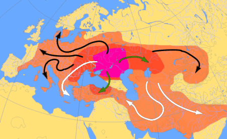 Sample Map of the IE languages expansion 4000-1000 BC, according to the Kurgan and Three-Stage hypothesis. In purple, the Yamna culture corresponding to PIE (4000-3500). In dark red and green arrows, expansion of IE II and Anatolian about 2500 BC. In lighter orange, spread of IE III dialects about 1000 BC, the black arrows signaling the Northern dialects expansion, the white ones that of the Southern dialects. [© gfdl]