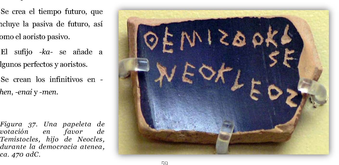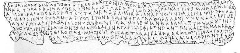 Figura 47. El katadesmos de Pella, un katadesmos (un hechizo mágico) inscrito en un manuscrito, probablemente escrito entre el 380 y el 350 adC. Se encontró en Pella (capital de Macedonia por entonces) en 1986, y fue publicado en la Hellenic Dialectology Journal in 1993.