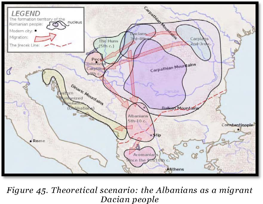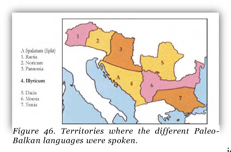 El argumento en favor de esta división temprana (antes del 300 adC) es el siguiente: las palabras propiamente albanesas (v.g. alb. motër 'hermana' < IE III māter 'madre') muestran la transformación del PIE ā > alb. /o/, pero en todos los préstamos latinos se da lat. /a:/ > alb. /a/. Esto indica que la transformación p-alb. /a:/ > p-alb. /o/ se dió y terminó como tendencia morfológica antes de la llegada de los romanos a los Balcanes. Por otra parte, el substrato de palabras rumanas compartidas con el albanés muestran una /a/ rumana que corresponde a una /o/ albanesa, cuando la fuente común es una /a:/ original (mazãre/modhull<*mādzula 'guisante'; raţå/rosë<*rātja: 'pato'), sugiriendo que cuando esas palabras tenían la misma forma común en pre-rumano y en proto-albanés, la transformación de palb. /a:/ > p-alb. /o/ no había comenzado. La correlación entre ambos hechos parece mostrar que la separación entre pre-rumano (los dacios posteriormente romanizados) y el proto-albanés sucedió antes de la llegada de los romanos a los balcanes.