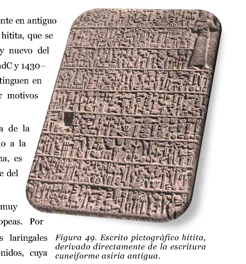 para otros escritos. La lengua hitita se ha clasificado tradicionalmente en antiguo hitita antiguo, hitita medio y neohitita o nuevo hitita, que se corresponden con los reinos antiguo, medio y Imperio Hitita, ca. 1750–1500 adC, 1500–1430 adC y 1430– 1180 adC, respectivamente. Estas etapas se distinguen en parte por motivos lingüísticos y en parte por paleográficos. El hitita se escribió en una forma adaptada escritura cuneiforme del antiguo asirio. Debido naturaleza eminentemente silábica de la misma, difícil saber el valor fonético exacto de una parte del inventario fonético hitita. El hitita conserva algunas características arcaicas perdidas en otras lenguas indoeuropeas. ejemplo, el hitita mostraba dos de las tres indoeuropeas, las iniciales h2 y h3. Estos sonidos, cuya